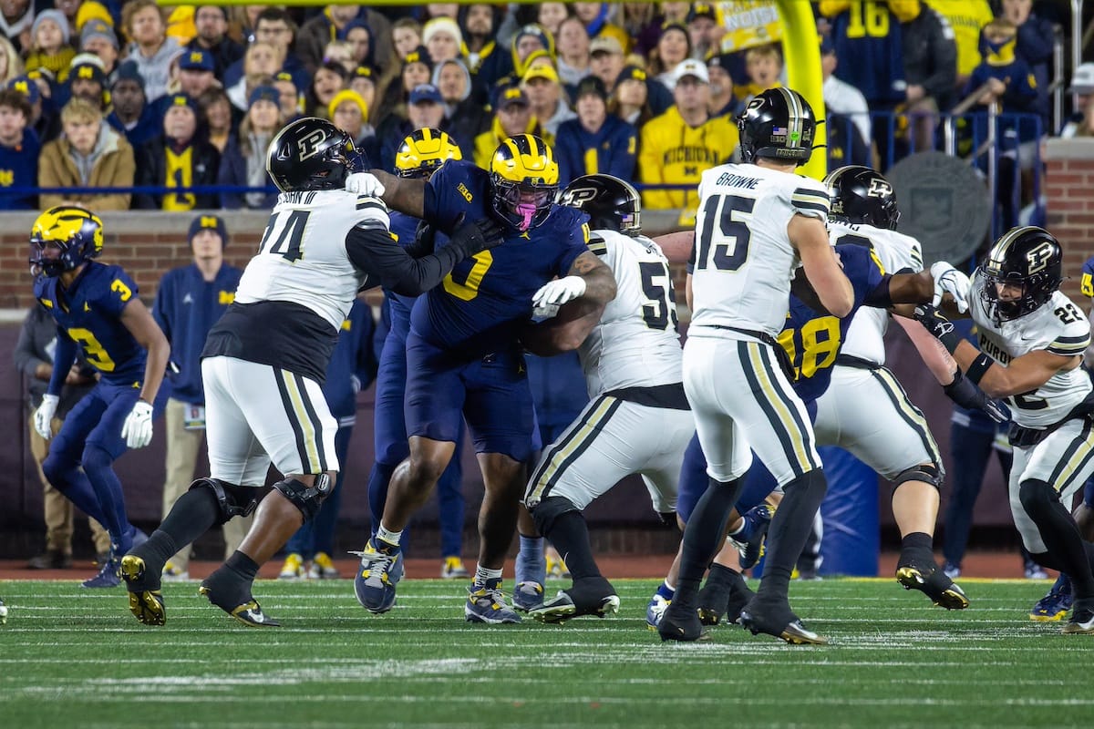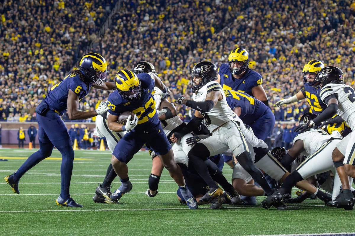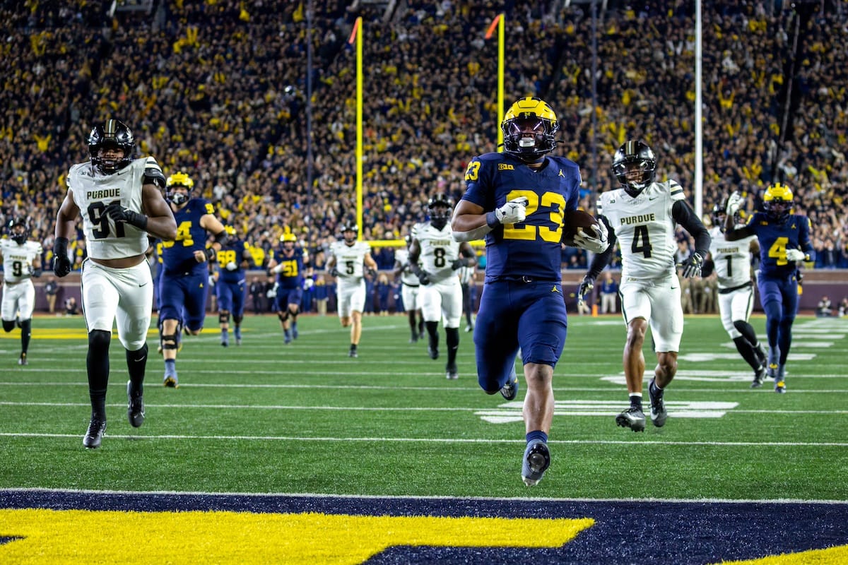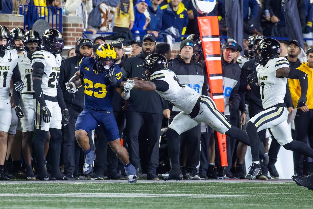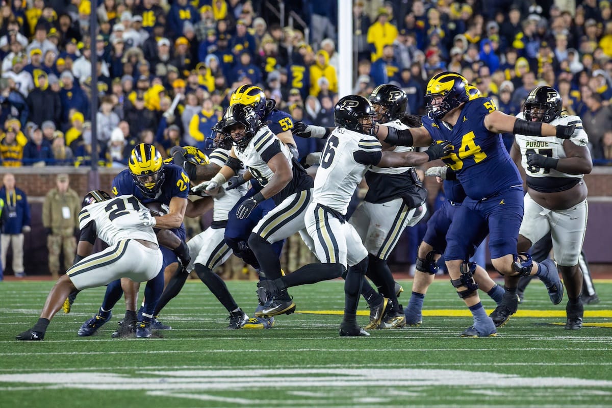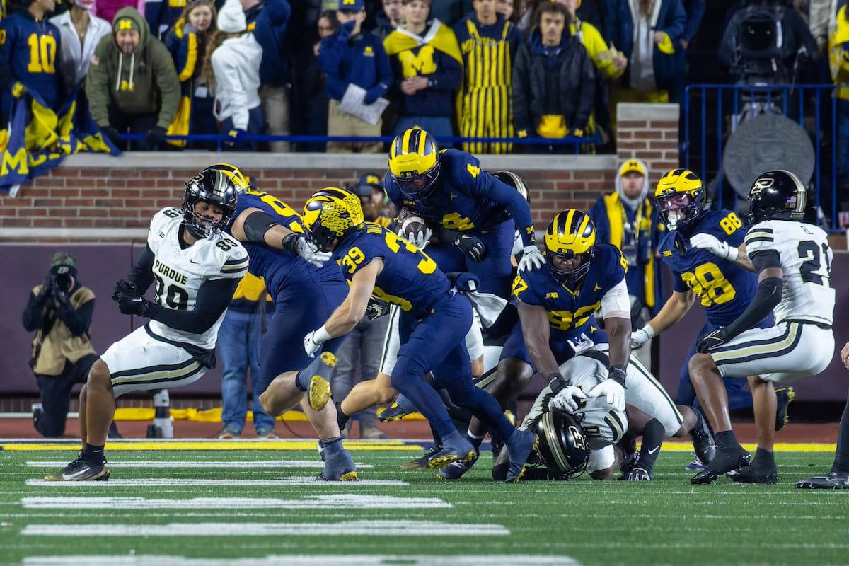 Former Michigan TE and Big Ten Network analyst Jake Butt poses for a selfie with fans. (Rachel Leggett/Mitten Football)Halloween costumes were plentiful at a game played the following day. (Rachel Leggett/Mitten Football)More costumes, these two as a pair of Jim Harbaughs. (Rachel Leggett/Mitten Football)Michigan Stadium with the lights turned down. (Rachel Leggett/Mitten Football)The banner, awaiting the Wolverines to come out of the tunnel pregame. (Rachel Leggett/Mitten Football)Running back Justice Haynes, who is out with an apparent foot injury, on a mobility scooter. (Rachel Leggett/Mitten Football)Tight ends Zack Marshall and Deakon Tonielli briefly pray pregame. (Rachel Leggett/Mitten Football)Ernest Hausmann makes a tackle with two other defenders bearing down. (Rachel Leggett/Mitten Football)TJ Metcalf wraps up a ball carrier in the open field. (Rachel Leggett/Mitten Football)The Wolverines hoisting sideline folding chairs above their heads to get the energy up. (Rachel Leggett/Mitten Football)No left sharks here. (Rachel Leggett/Mitten Football)Blake Frazier's right arm tattoo, which appears to be a Wolverine. (Rachel Leggett/Mitten Football)Jordan Marshall runs away from a defender, a common sight on Saturday night. (Rachel Leggett/Mitten Football)The Wolverines signal for a first down after a short yardage play. (Rachel Leggett/Mitten Football)Running back Bryson Kuzdzal runs through contact, backing up Marshall with Haynes out. (Rachel Leggett/Mitten Football)Marshall squeezing out a scrum to score a touchdown. (Rachel Leggett/Mitten Football)Marshall slips free from the thicket of defenders. (Rachel Leggett/Mitten Football)And with some balance and acceleration, he started to scamper away. (Rachel Leggett/Mitten Football)All the defenders could do is watch. (Rachel Leggett/Mitten Football)And Marshall got to celebrate one of his three touchdowns on the night. (Rachel Leggett/Mitten Football)Marshall finished with a career-high 210 total yards. (Rachel Leggett/Mitten Football)The other Marshall, tight end Zack Marshall, moves through traffic after making a catch. (Rachel Leggett/Mitten Football)TJ Metcalf hurdles over a ball carrier down on the ground. (Rachel Leggett/Mitten Football)Channing Goodwin holds on tight to make a reception down the right sideline. (Rachel Leggett/Mitten Football)Tre Williams celebrates a play at the line of scrimmage. Michigan held Purdue to 276 total yards. (Rachel Leggett/Mitten Football)Marlin Klein gets dumped to the turf by a trio of defenders. (Rachel Leggett/Mitten Football)Purdue defenders celebrate one of two turnovers off of Bryce Underwood. (Rachel Leggett/Mitten Football)Underwood looks to run from the pocket behind Jake Guarnera blocking. (Rachel Leggett/Mitten Football)Underwood calls out a check to the offense. (Rachel Leggett/Mitten Football)Underwood gets brought down by a group of Boilermakers. (Rachel Leggett/Mitten Football)Michigan fans, perplexed. (Rachel Leggett/Mitten Football)Andrew Marsh tries to maneuver through traffic with the ball. (Rachel Leggett/Mitten Football)Marshall runs away for defenders for another of his three TDs. (Rachel Leggett/Mitten Football)A Purdue defender lays out to push Marshall out of bounds. (Rachel Leggett/Mitten Football)Wideout Logan Forbes runs down as a punt gunner. (Rachel Leggett/Mitten Football)Hausmann wags a finger after making a play. (Rachel Leggett/Mitten Football)The Michigan defense swarms to make a tackle. (Rachel Leggett/Mitten Football)Williams bullies through the line to pursue Purdue QB Ryan Browne. (Rachel Leggett/Mitten Football)Edge rusher TJ Guy celebrates. (Rachel Leggett/Mitten Football)Underwood and Marshall shake hands in the end zone after a score. (Rachel Leggett/Mitten Football)The Michigan Marching Band's drum line performs. (Rachel Leggett/Mitten Football)Head coach Sherrone Moore interviewed on Big Ten Network postgame. (Rachel Leggett/Mitten Football)Marshall and Underwood both got some air time, too. (Rachel Leggett/Mitten Football)And Marshall, the start of the night, made some time with fans postgame. (Rachel Leggett/Mitten Football)And it was a good night for selfie-seekers at the Michigan Stadium tunnel. (Rachel Leggett/Mitten Football)