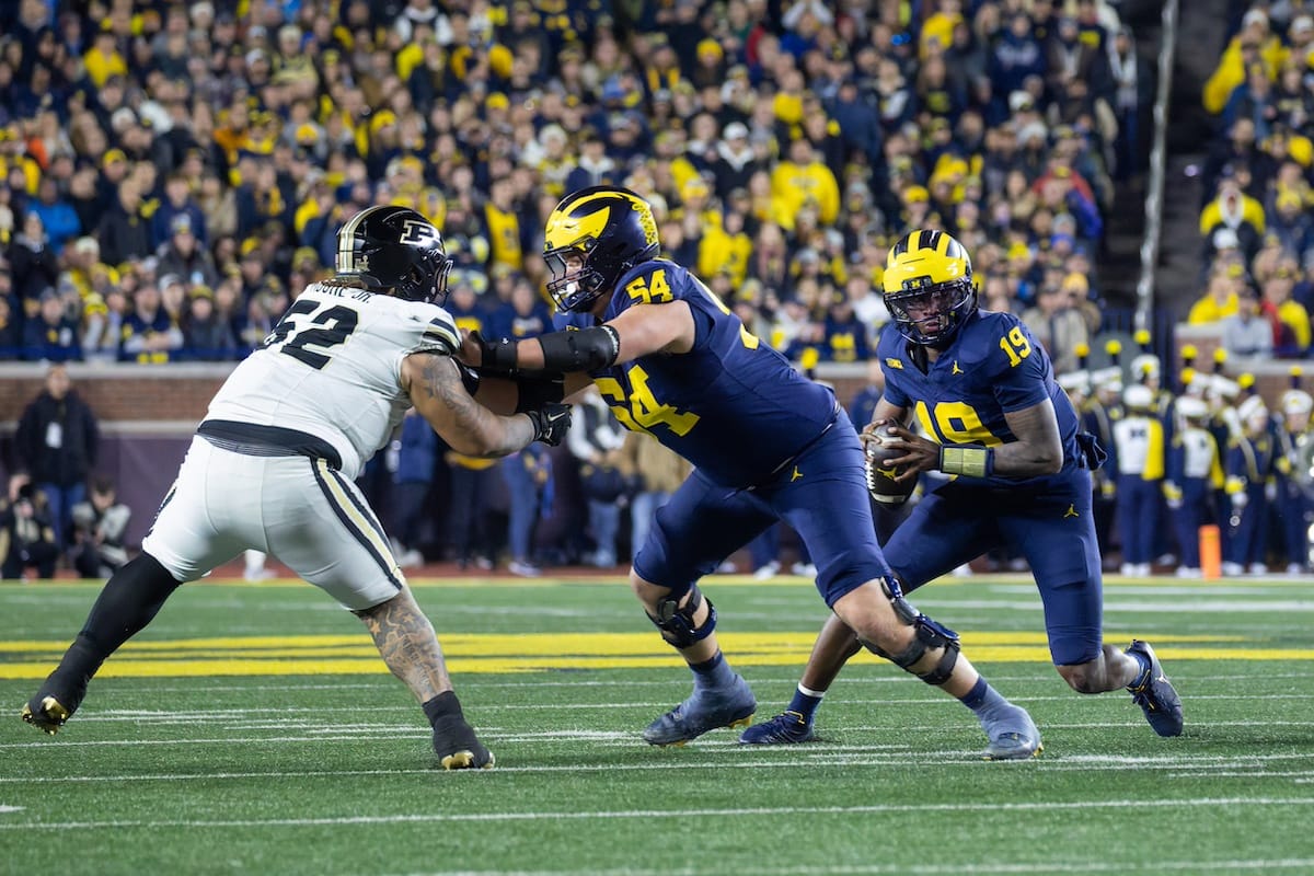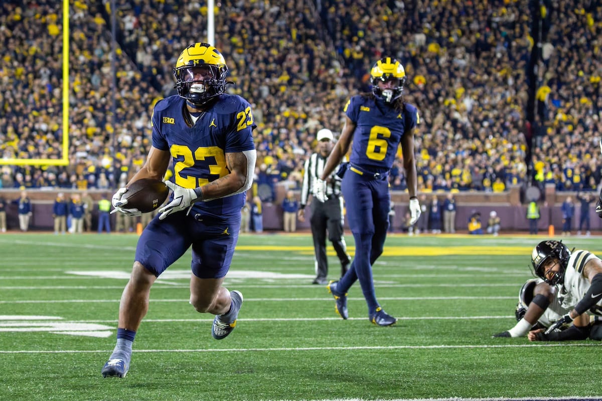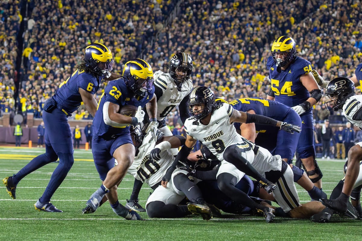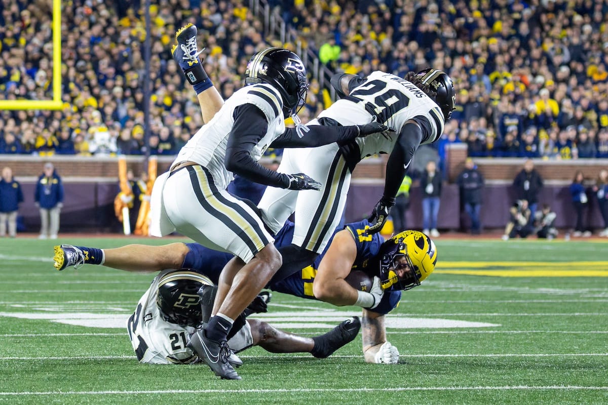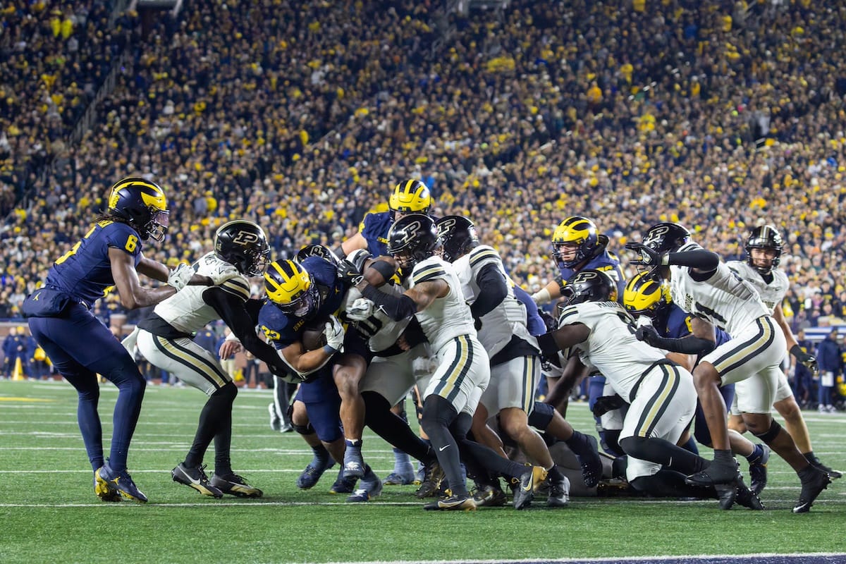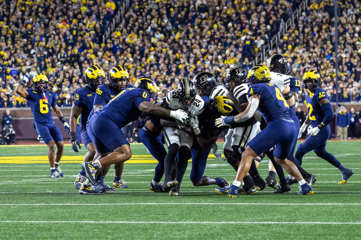 Former Michigan TE and Big Ten Network analyst Jake Butt poses for a selfie with fans. (Rachel Leggett/Mitten Football)Halloween costumes were plentiful at a game played the following day. (Rachel Leggett/Mitten Football)More costumes, these two as a pair of Jim Harbaughs. (Rachel Leggett/Mitten Football)Michigan Stadium with the lights turned down. (Rachel Leggett/Mitten Football)The banner, awaiting the Wolverines to come out of the tunnel pregame. (Rachel Leggett/Mitten Football)Running back Justice Haynes, who is out with an apparent foot injury, on a mobility scooter. (Rachel Leggett/Mitten Football)Tight ends Zack Marshall and Deakon Tonielli briefly pray pregame. (Rachel Leggett/Mitten Football)Ernest Hausmann makes a tackle with two other defenders bearing down. (Rachel Leggett/Mitten Football)TJ Metcalf wraps up a ball carrier in the open field. (Rachel Leggett/Mitten Football)The Wolverines hoisting sideline folding chairs above their heads to get the energy up. (Rachel Leggett/Mitten Football)No left sharks here. (Rachel Leggett/Mitten Football)Blake Frazier's right arm tattoo, which appears to be a Wolverine. (Rachel Leggett/Mitten Football)Jordan Marshall runs away from a defender, a common sight on Saturday night. (Rachel Leggett/Mitten Football)The Wolverines signal for a first down after a short yardage play. (Rachel Leggett/Mitten Football)Running back Bryson Kuzdzal runs through contact, backing up Marshall with Haynes out. (Rachel Leggett/Mitten Football)Marshall squeezing out a scrum to score a touchdown. (Rachel Leggett/Mitten Football)Marshall slips free from the thicket of defenders. (Rachel Leggett/Mitten Football)And with some balance and acceleration, he started to scamper away. (Rachel Leggett/Mitten Football)All the defenders could do is watch. (Rachel Leggett/Mitten Football)And Marshall got to celebrate one of his three touchdowns on the night. (Rachel Leggett/Mitten Football)Marshall finished with a career-high 210 total yards. (Rachel Leggett/Mitten Football)The other Marshall, tight end Zack Marshall, moves through traffic after making a catch. (Rachel Leggett/Mitten Football)TJ Metcalf hurdles over a ball carrier down on the ground. (Rachel Leggett/Mitten Football)Channing Goodwin holds on tight to make a reception down the right sideline. (Rachel Leggett/Mitten Football)Tre Williams celebrates a play at the line of scrimmage. Michigan held Purdue to 276 total yards. (Rachel Leggett/Mitten Football)Marlin Klein gets dumped to the turf by a trio of defenders. (Rachel Leggett/Mitten Football)Purdue defenders celebrate one of two turnovers off of Bryce Underwood. (Rachel Leggett/Mitten Football)Underwood looks to run from the pocket behind Jake Guarnera blocking. (Rachel Leggett/Mitten Football)Underwood calls out a check to the offense. (Rachel Leggett/Mitten Football)Underwood gets brought down by a group of Boilermakers. (Rachel Leggett/Mitten Football)Michigan fans, perplexed. (Rachel Leggett/Mitten Football)Andrew Marsh tries to maneuver through traffic with the ball. (Rachel Leggett/Mitten Football)Marshall runs away for defenders for another of his three TDs. (Rachel Leggett/Mitten Football)A Purdue defender lays out to push Marshall out of bounds. (Rachel Leggett/Mitten Football)Wideout Logan Forbes runs down as a punt gunner. (Rachel Leggett/Mitten Football)Hausmann wags a finger after making a play. (Rachel Leggett/Mitten Football)The Michigan defense swarms to make a tackle. (Rachel Leggett/Mitten Football)Williams bullies through the line to pursue Purdue QB Ryan Browne. (Rachel Leggett/Mitten Football)Edge rusher TJ Guy celebrates. (Rachel Leggett/Mitten Football)Underwood and Marshall shake hands in the end zone after a score. (Rachel Leggett/Mitten Football)The Michigan Marching Band's drum line performs. (Rachel Leggett/Mitten Football)Head coach Sherrone Moore interviewed on Big Ten Network postgame. (Rachel Leggett/Mitten Football)Marshall and Underwood both got some air time, too. (Rachel Leggett/Mitten Football)And Marshall, the start of the night, made some time with fans postgame. (Rachel Leggett/Mitten Football)And it was a good night for selfie-seekers at the Michigan Stadium tunnel. (Rachel Leggett/Mitten Football)