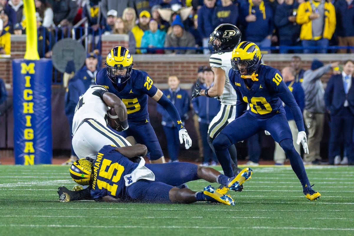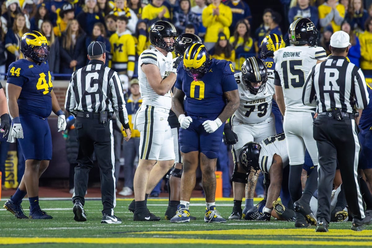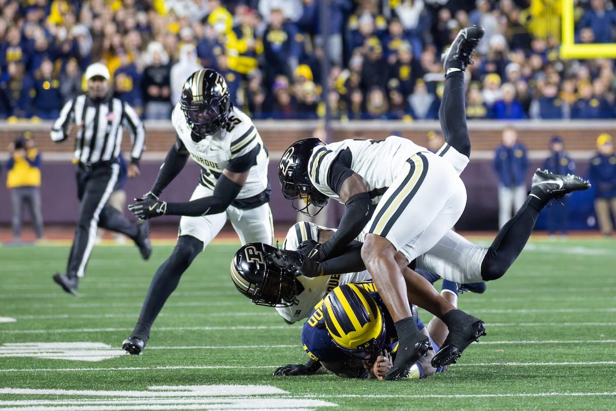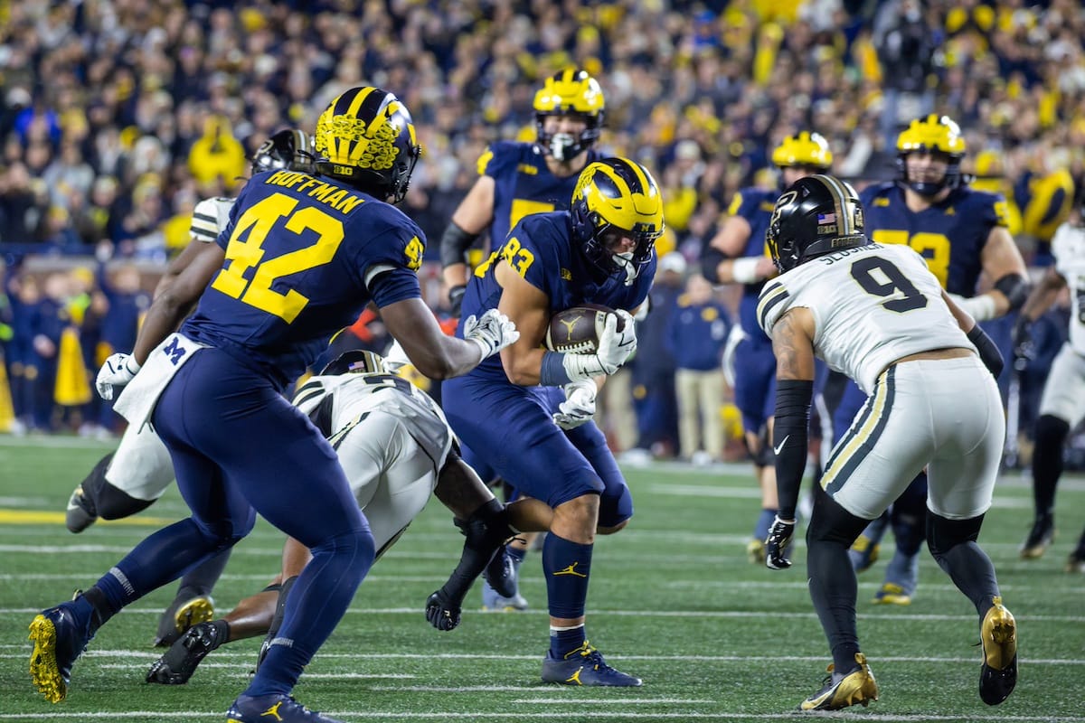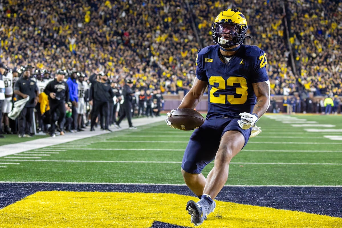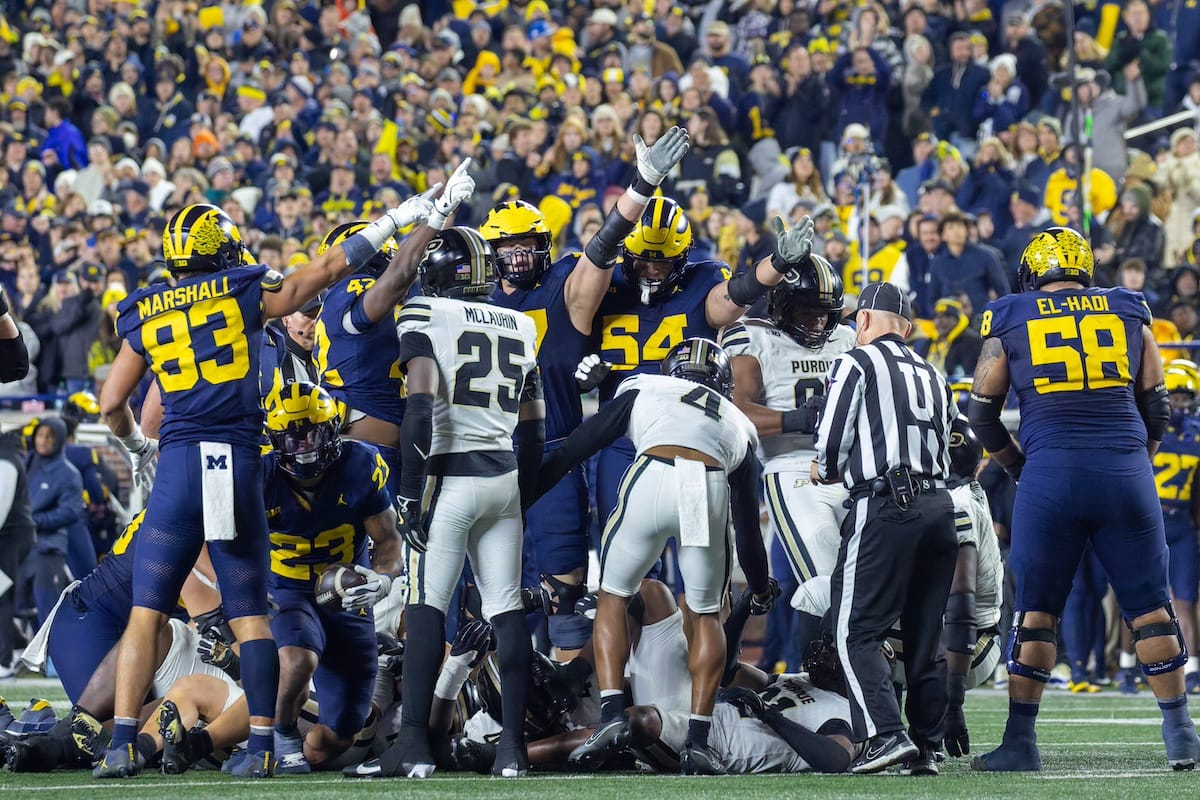 Former Michigan TE and Big Ten Network analyst Jake Butt poses for a selfie with fans. (Rachel Leggett/Mitten Football)Halloween costumes were plentiful at a game played the following day. (Rachel Leggett/Mitten Football)More costumes, these two as a pair of Jim Harbaughs. (Rachel Leggett/Mitten Football)Michigan Stadium with the lights turned down. (Rachel Leggett/Mitten Football)The banner, awaiting the Wolverines to come out of the tunnel pregame. (Rachel Leggett/Mitten Football)Running back Justice Haynes, who is out with an apparent foot injury, on a mobility scooter. (Rachel Leggett/Mitten Football)Tight ends Zack Marshall and Deakon Tonielli briefly pray pregame. (Rachel Leggett/Mitten Football)Ernest Hausmann makes a tackle with two other defenders bearing down. (Rachel Leggett/Mitten Football)TJ Metcalf wraps up a ball carrier in the open field. (Rachel Leggett/Mitten Football)The Wolverines hoisting sideline folding chairs above their heads to get the energy up. (Rachel Leggett/Mitten Football)No left sharks here. (Rachel Leggett/Mitten Football)Blake Frazier's right arm tattoo, which appears to be a Wolverine. (Rachel Leggett/Mitten Football)Jordan Marshall runs away from a defender, a common sight on Saturday night. (Rachel Leggett/Mitten Football)The Wolverines signal for a first down after a short yardage play. (Rachel Leggett/Mitten Football)Running back Bryson Kuzdzal runs through contact, backing up Marshall with Haynes out. (Rachel Leggett/Mitten Football)Marshall squeezing out a scrum to score a touchdown. (Rachel Leggett/Mitten Football)Marshall slips free from the thicket of defenders. (Rachel Leggett/Mitten Football)And with some balance and acceleration, he started to scamper away. (Rachel Leggett/Mitten Football)All the defenders could do is watch. (Rachel Leggett/Mitten Football)And Marshall got to celebrate one of his three touchdowns on the night. (Rachel Leggett/Mitten Football)Marshall finished with a career-high 210 total yards. (Rachel Leggett/Mitten Football)The other Marshall, tight end Zack Marshall, moves through traffic after making a catch. (Rachel Leggett/Mitten Football)TJ Metcalf hurdles over a ball carrier down on the ground. (Rachel Leggett/Mitten Football)Channing Goodwin holds on tight to make a reception down the right sideline. (Rachel Leggett/Mitten Football)Tre Williams celebrates a play at the line of scrimmage. Michigan held Purdue to 276 total yards. (Rachel Leggett/Mitten Football)Marlin Klein gets dumped to the turf by a trio of defenders. (Rachel Leggett/Mitten Football)Purdue defenders celebrate one of two turnovers off of Bryce Underwood. (Rachel Leggett/Mitten Football)Underwood looks to run from the pocket behind Jake Guarnera blocking. (Rachel Leggett/Mitten Football)Underwood calls out a check to the offense. (Rachel Leggett/Mitten Football)Underwood gets brought down by a group of Boilermakers. (Rachel Leggett/Mitten Football)Michigan fans, perplexed. (Rachel Leggett/Mitten Football)Andrew Marsh tries to maneuver through traffic with the ball. (Rachel Leggett/Mitten Football)Marshall runs away for defenders for another of his three TDs. (Rachel Leggett/Mitten Football)A Purdue defender lays out to push Marshall out of bounds. (Rachel Leggett/Mitten Football)Wideout Logan Forbes runs down as a punt gunner. (Rachel Leggett/Mitten Football)Hausmann wags a finger after making a play. (Rachel Leggett/Mitten Football)The Michigan defense swarms to make a tackle. (Rachel Leggett/Mitten Football)Williams bullies through the line to pursue Purdue QB Ryan Browne. (Rachel Leggett/Mitten Football)Edge rusher TJ Guy celebrates. (Rachel Leggett/Mitten Football)Underwood and Marshall shake hands in the end zone after a score. (Rachel Leggett/Mitten Football)The Michigan Marching Band's drum line performs. (Rachel Leggett/Mitten Football)Head coach Sherrone Moore interviewed on Big Ten Network postgame. (Rachel Leggett/Mitten Football)Marshall and Underwood both got some air time, too. (Rachel Leggett/Mitten Football)And Marshall, the start of the night, made some time with fans postgame. (Rachel Leggett/Mitten Football)And it was a good night for selfie-seekers at the Michigan Stadium tunnel. (Rachel Leggett/Mitten Football)