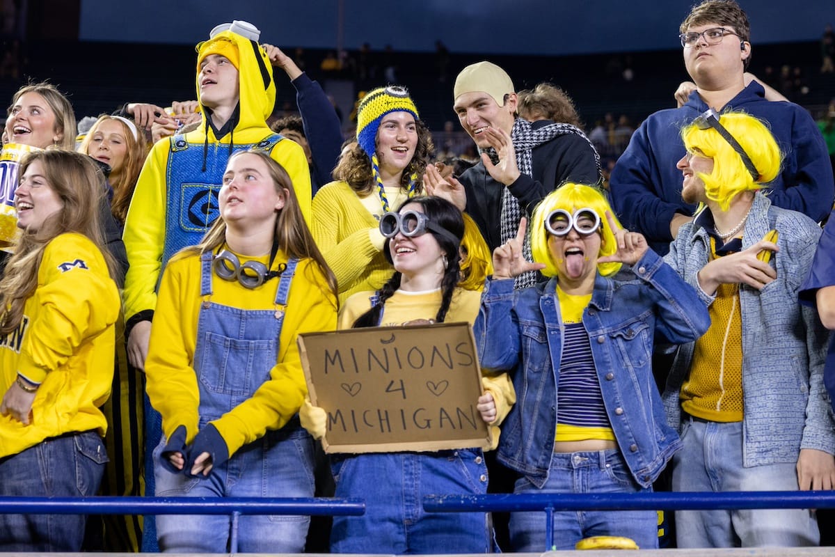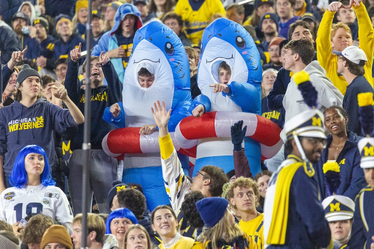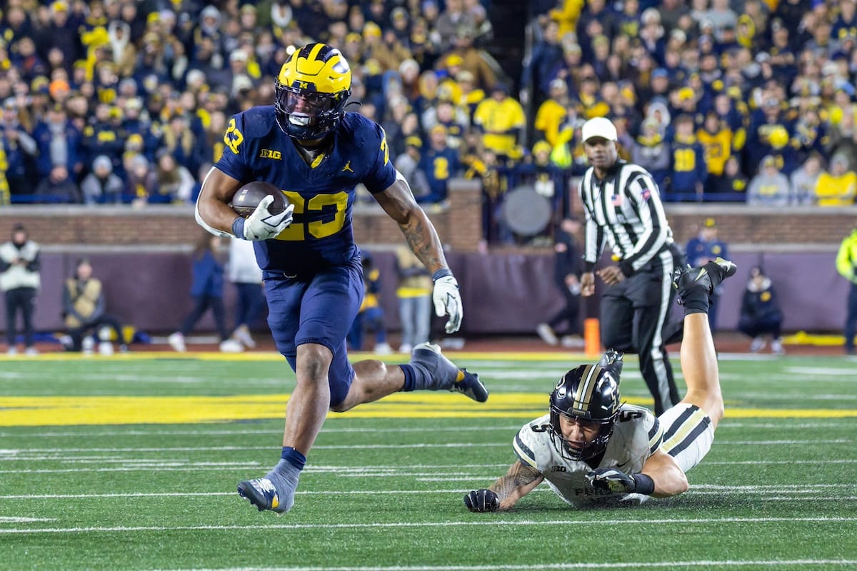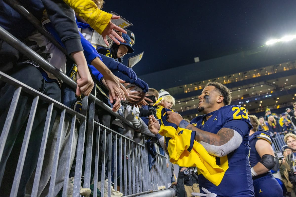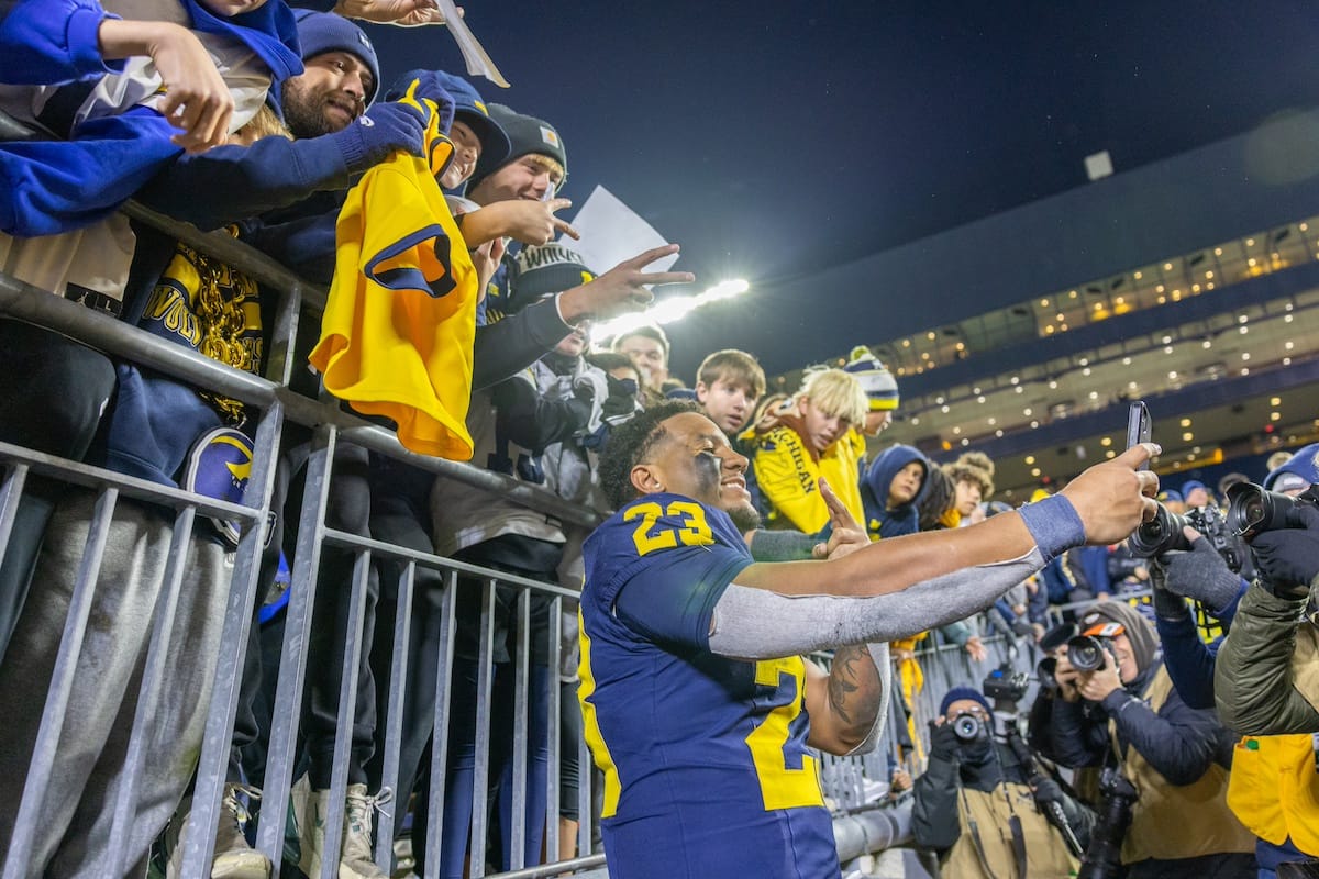 Former Michigan TE and Big Ten Network analyst Jake Butt poses for a selfie with fans. (Rachel Leggett/Mitten Football)Halloween costumes were plentiful at a game played the following day. (Rachel Leggett/Mitten Football)More costumes, these two as a pair of Jim Harbaughs. (Rachel Leggett/Mitten Football)Michigan Stadium with the lights turned down. (Rachel Leggett/Mitten Football)The banner, awaiting the Wolverines to come out of the tunnel pregame. (Rachel Leggett/Mitten Football)Running back Justice Haynes, who is out with an apparent foot injury, on a mobility scooter. (Rachel Leggett/Mitten Football)Tight ends Zack Marshall and Deakon Tonielli briefly pray pregame. (Rachel Leggett/Mitten Football)Ernest Hausmann makes a tackle with two other defenders bearing down. (Rachel Leggett/Mitten Football)TJ Metcalf wraps up a ball carrier in the open field. (Rachel Leggett/Mitten Football)The Wolverines hoisting sideline folding chairs above their heads to get the energy up. (Rachel Leggett/Mitten Football)No left sharks here. (Rachel Leggett/Mitten Football)Blake Frazier's right arm tattoo, which appears to be a Wolverine. (Rachel Leggett/Mitten Football)Jordan Marshall runs away from a defender, a common sight on Saturday night. (Rachel Leggett/Mitten Football)The Wolverines signal for a first down after a short yardage play. (Rachel Leggett/Mitten Football)Running back Bryson Kuzdzal runs through contact, backing up Marshall with Haynes out. (Rachel Leggett/Mitten Football)Marshall squeezing out a scrum to score a touchdown. (Rachel Leggett/Mitten Football)Marshall slips free from the thicket of defenders. (Rachel Leggett/Mitten Football)And with some balance and acceleration, he started to scamper away. (Rachel Leggett/Mitten Football)All the defenders could do is watch. (Rachel Leggett/Mitten Football)And Marshall got to celebrate one of his three touchdowns on the night. (Rachel Leggett/Mitten Football)Marshall finished with a career-high 210 total yards. (Rachel Leggett/Mitten Football)The other Marshall, tight end Zack Marshall, moves through traffic after making a catch. (Rachel Leggett/Mitten Football)TJ Metcalf hurdles over a ball carrier down on the ground. (Rachel Leggett/Mitten Football)Channing Goodwin holds on tight to make a reception down the right sideline. (Rachel Leggett/Mitten Football)Tre Williams celebrates a play at the line of scrimmage. Michigan held Purdue to 276 total yards. (Rachel Leggett/Mitten Football)Marlin Klein gets dumped to the turf by a trio of defenders. (Rachel Leggett/Mitten Football)Purdue defenders celebrate one of two turnovers off of Bryce Underwood. (Rachel Leggett/Mitten Football)Underwood looks to run from the pocket behind Jake Guarnera blocking. (Rachel Leggett/Mitten Football)Underwood calls out a check to the offense. (Rachel Leggett/Mitten Football)Underwood gets brought down by a group of Boilermakers. (Rachel Leggett/Mitten Football)Michigan fans, perplexed. (Rachel Leggett/Mitten Football)Andrew Marsh tries to maneuver through traffic with the ball. (Rachel Leggett/Mitten Football)Marshall runs away for defenders for another of his three TDs. (Rachel Leggett/Mitten Football)A Purdue defender lays out to push Marshall out of bounds. (Rachel Leggett/Mitten Football)Wideout Logan Forbes runs down as a punt gunner. (Rachel Leggett/Mitten Football)Hausmann wags a finger after making a play. (Rachel Leggett/Mitten Football)The Michigan defense swarms to make a tackle. (Rachel Leggett/Mitten Football)Williams bullies through the line to pursue Purdue QB Ryan Browne. (Rachel Leggett/Mitten Football)Edge rusher TJ Guy celebrates. (Rachel Leggett/Mitten Football)Underwood and Marshall shake hands in the end zone after a score. (Rachel Leggett/Mitten Football)The Michigan Marching Band's drum line performs. (Rachel Leggett/Mitten Football)Head coach Sherrone Moore interviewed on Big Ten Network postgame. (Rachel Leggett/Mitten Football)Marshall and Underwood both got some air time, too. (Rachel Leggett/Mitten Football)And Marshall, the start of the night, made some time with fans postgame. (Rachel Leggett/Mitten Football)And it was a good night for selfie-seekers at the Michigan Stadium tunnel. (Rachel Leggett/Mitten Football)