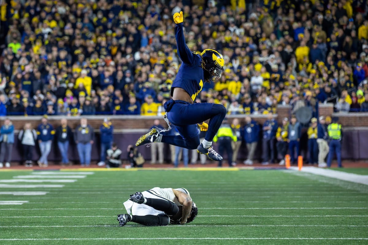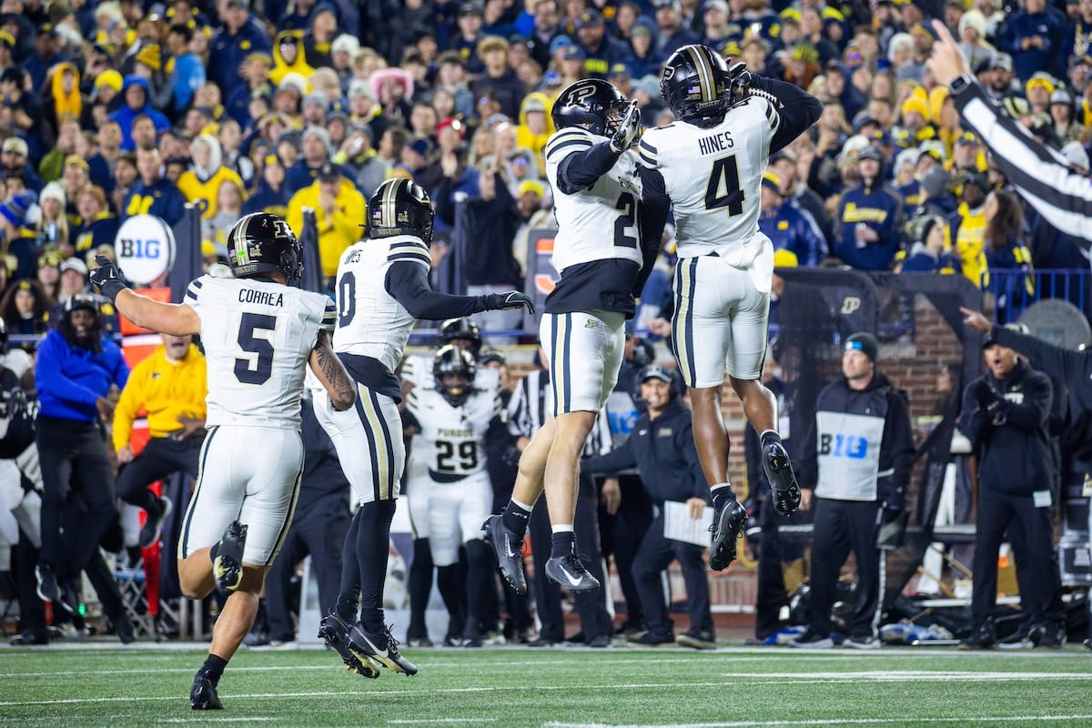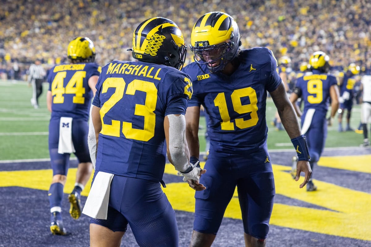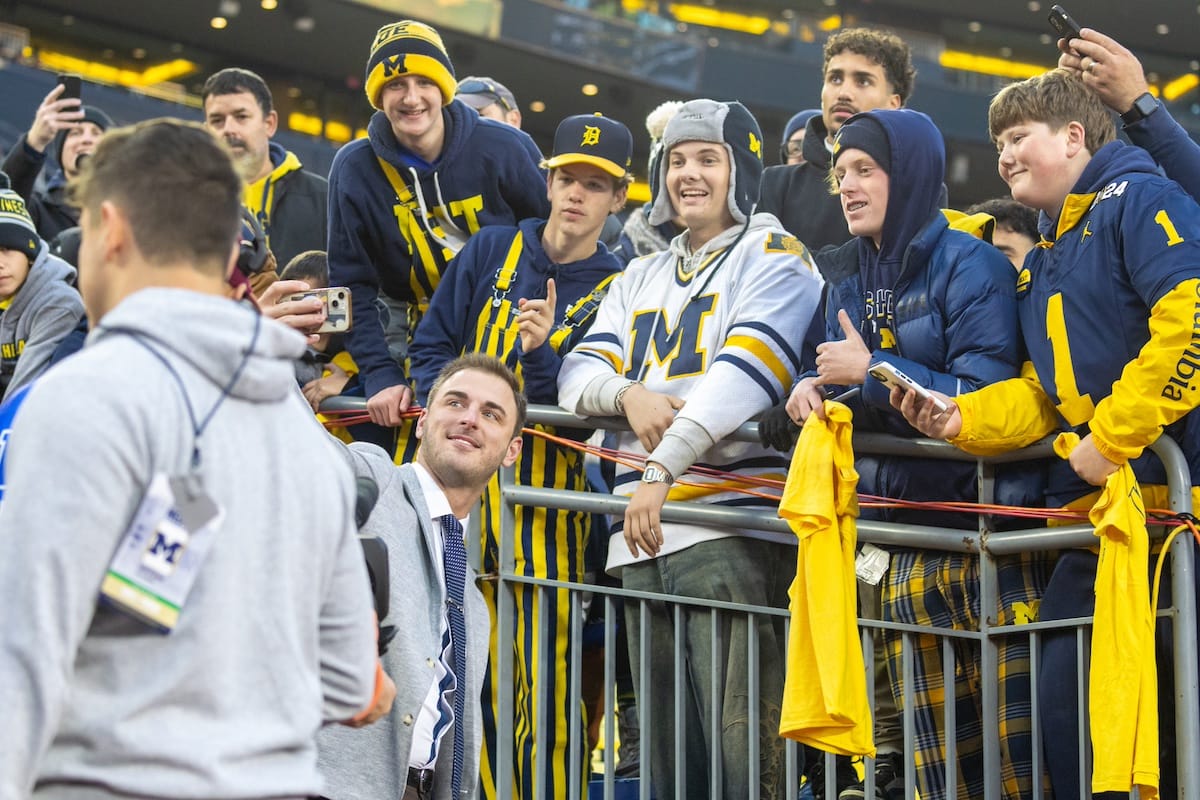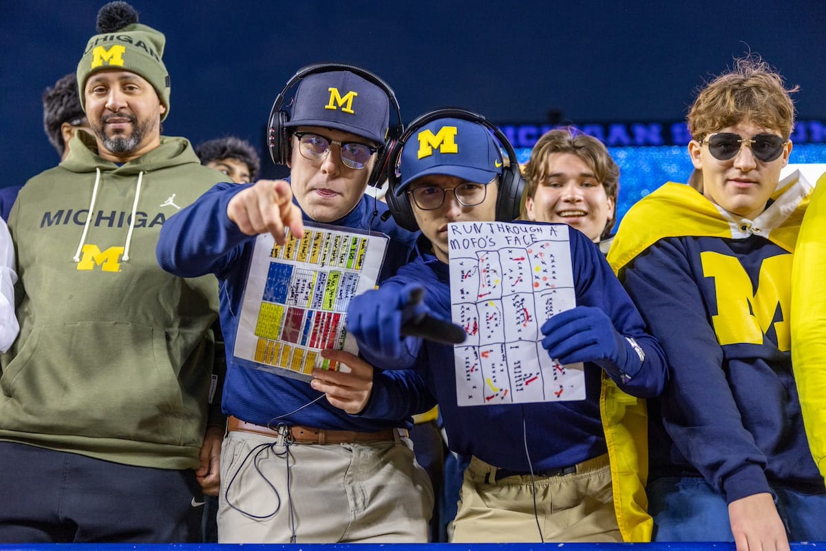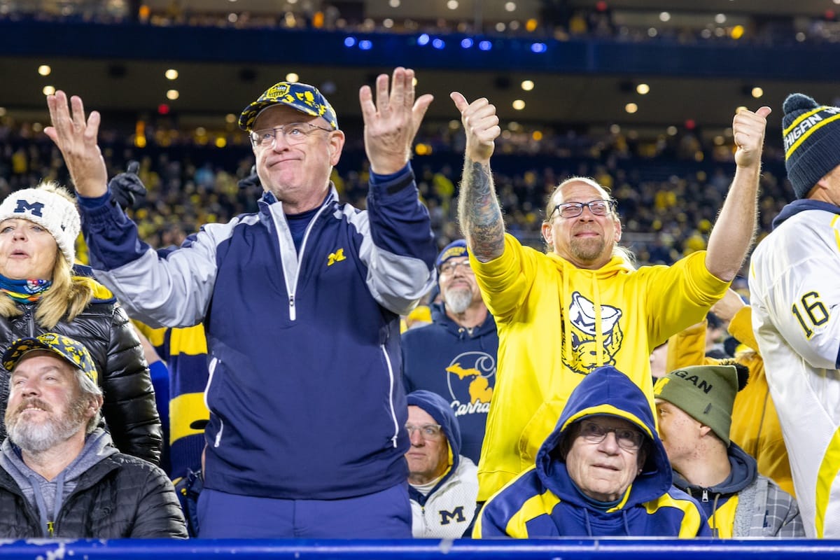 Former Michigan TE and Big Ten Network analyst Jake Butt poses for a selfie with fans. (Rachel Leggett/Mitten Football)Halloween costumes were plentiful at a game played the following day. (Rachel Leggett/Mitten Football)More costumes, these two as a pair of Jim Harbaughs. (Rachel Leggett/Mitten Football)Michigan Stadium with the lights turned down. (Rachel Leggett/Mitten Football)The banner, awaiting the Wolverines to come out of the tunnel pregame. (Rachel Leggett/Mitten Football)Running back Justice Haynes, who is out with an apparent foot injury, on a mobility scooter. (Rachel Leggett/Mitten Football)Tight ends Zack Marshall and Deakon Tonielli briefly pray pregame. (Rachel Leggett/Mitten Football)Ernest Hausmann makes a tackle with two other defenders bearing down. (Rachel Leggett/Mitten Football)TJ Metcalf wraps up a ball carrier in the open field. (Rachel Leggett/Mitten Football)The Wolverines hoisting sideline folding chairs above their heads to get the energy up. (Rachel Leggett/Mitten Football)No left sharks here. (Rachel Leggett/Mitten Football)Blake Frazier's right arm tattoo, which appears to be a Wolverine. (Rachel Leggett/Mitten Football)Jordan Marshall runs away from a defender, a common sight on Saturday night. (Rachel Leggett/Mitten Football)The Wolverines signal for a first down after a short yardage play. (Rachel Leggett/Mitten Football)Running back Bryson Kuzdzal runs through contact, backing up Marshall with Haynes out. (Rachel Leggett/Mitten Football)Marshall squeezing out a scrum to score a touchdown. (Rachel Leggett/Mitten Football)Marshall slips free from the thicket of defenders. (Rachel Leggett/Mitten Football)And with some balance and acceleration, he started to scamper away. (Rachel Leggett/Mitten Football)All the defenders could do is watch. (Rachel Leggett/Mitten Football)And Marshall got to celebrate one of his three touchdowns on the night. (Rachel Leggett/Mitten Football)Marshall finished with a career-high 210 total yards. (Rachel Leggett/Mitten Football)The other Marshall, tight end Zack Marshall, moves through traffic after making a catch. (Rachel Leggett/Mitten Football)TJ Metcalf hurdles over a ball carrier down on the ground. (Rachel Leggett/Mitten Football)Channing Goodwin holds on tight to make a reception down the right sideline. (Rachel Leggett/Mitten Football)Tre Williams celebrates a play at the line of scrimmage. Michigan held Purdue to 276 total yards. (Rachel Leggett/Mitten Football)Marlin Klein gets dumped to the turf by a trio of defenders. (Rachel Leggett/Mitten Football)Purdue defenders celebrate one of two turnovers off of Bryce Underwood. (Rachel Leggett/Mitten Football)Underwood looks to run from the pocket behind Jake Guarnera blocking. (Rachel Leggett/Mitten Football)Underwood calls out a check to the offense. (Rachel Leggett/Mitten Football)Underwood gets brought down by a group of Boilermakers. (Rachel Leggett/Mitten Football)Michigan fans, perplexed. (Rachel Leggett/Mitten Football)Andrew Marsh tries to maneuver through traffic with the ball. (Rachel Leggett/Mitten Football)Marshall runs away for defenders for another of his three TDs. (Rachel Leggett/Mitten Football)A Purdue defender lays out to push Marshall out of bounds. (Rachel Leggett/Mitten Football)Wideout Logan Forbes runs down as a punt gunner. (Rachel Leggett/Mitten Football)Hausmann wags a finger after making a play. (Rachel Leggett/Mitten Football)The Michigan defense swarms to make a tackle. (Rachel Leggett/Mitten Football)Williams bullies through the line to pursue Purdue QB Ryan Browne. (Rachel Leggett/Mitten Football)Edge rusher TJ Guy celebrates. (Rachel Leggett/Mitten Football)Underwood and Marshall shake hands in the end zone after a score. (Rachel Leggett/Mitten Football)The Michigan Marching Band's drum line performs. (Rachel Leggett/Mitten Football)Head coach Sherrone Moore interviewed on Big Ten Network postgame. (Rachel Leggett/Mitten Football)Marshall and Underwood both got some air time, too. (Rachel Leggett/Mitten Football)And Marshall, the start of the night, made some time with fans postgame. (Rachel Leggett/Mitten Football)And it was a good night for selfie-seekers at the Michigan Stadium tunnel. (Rachel Leggett/Mitten Football)