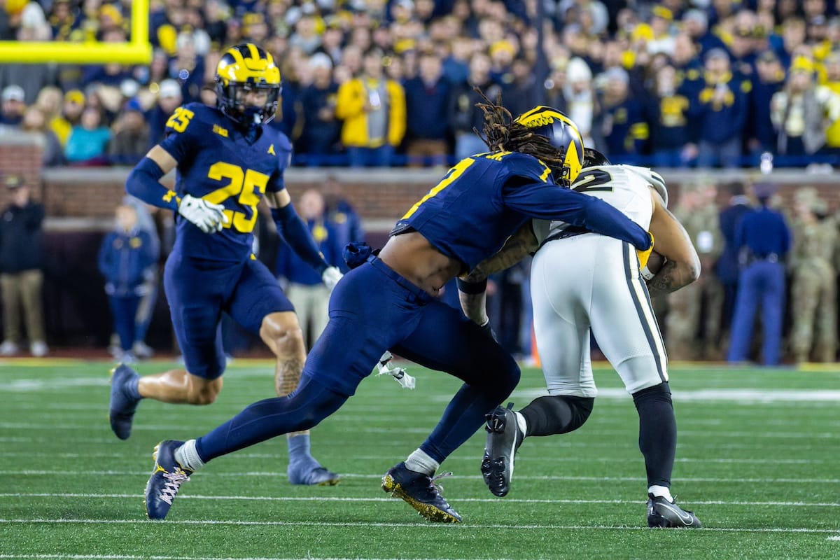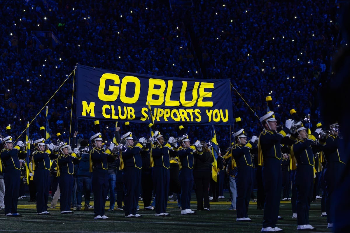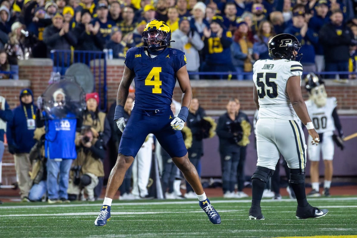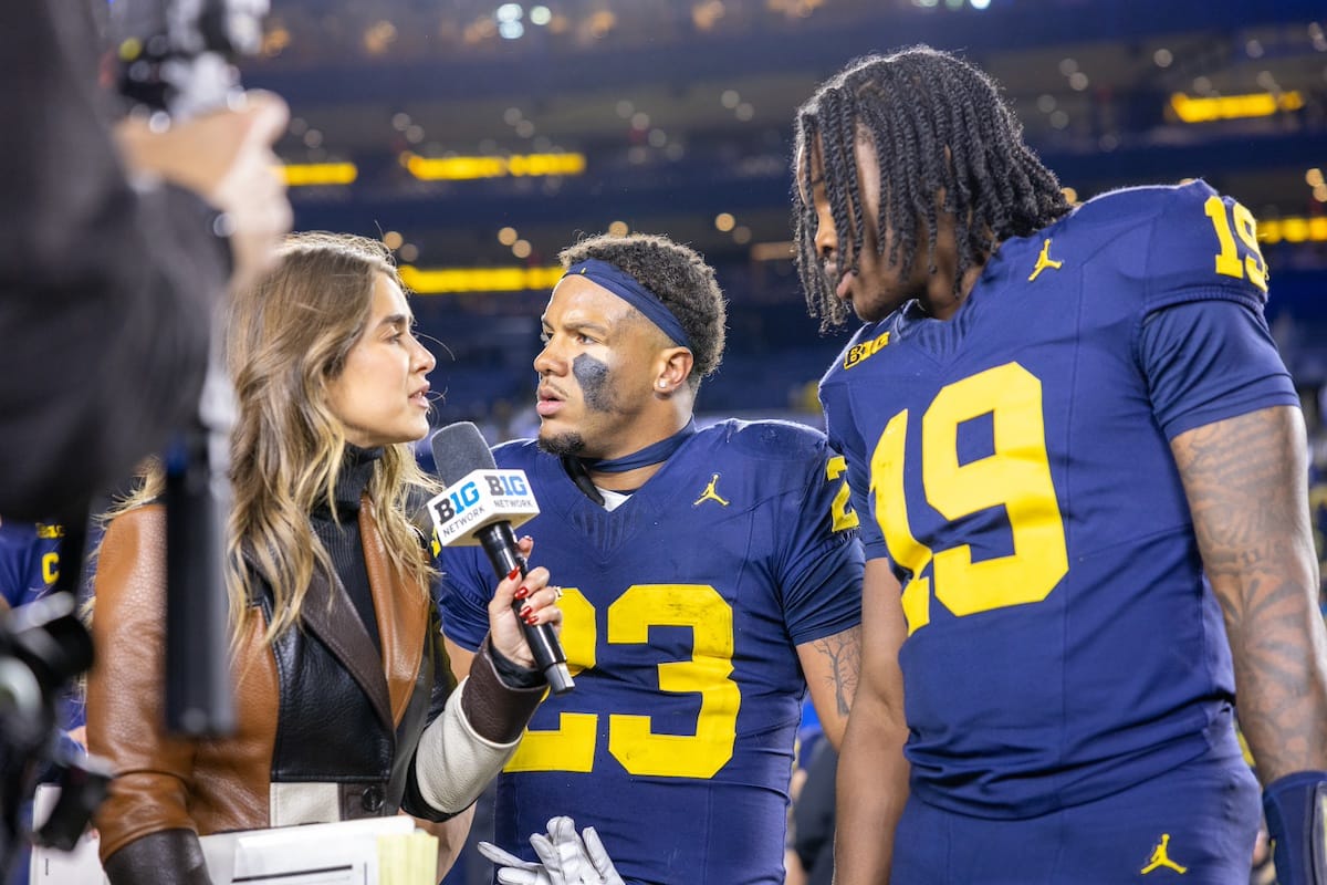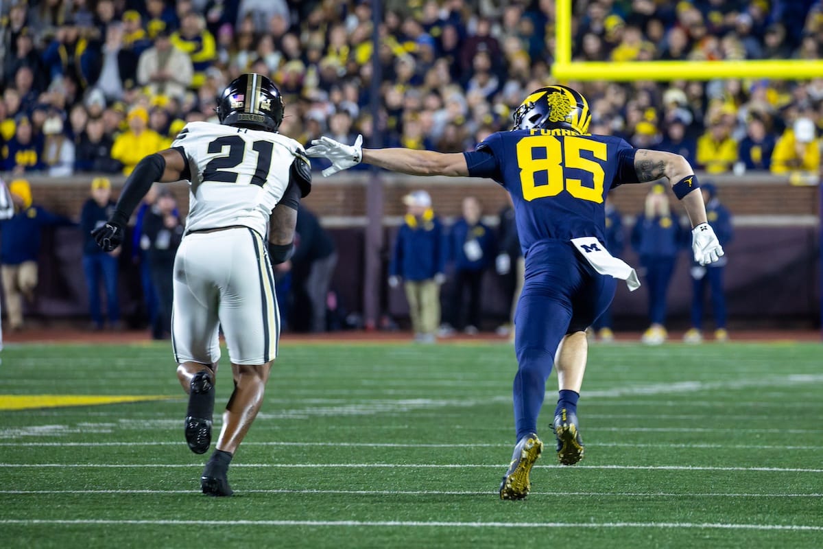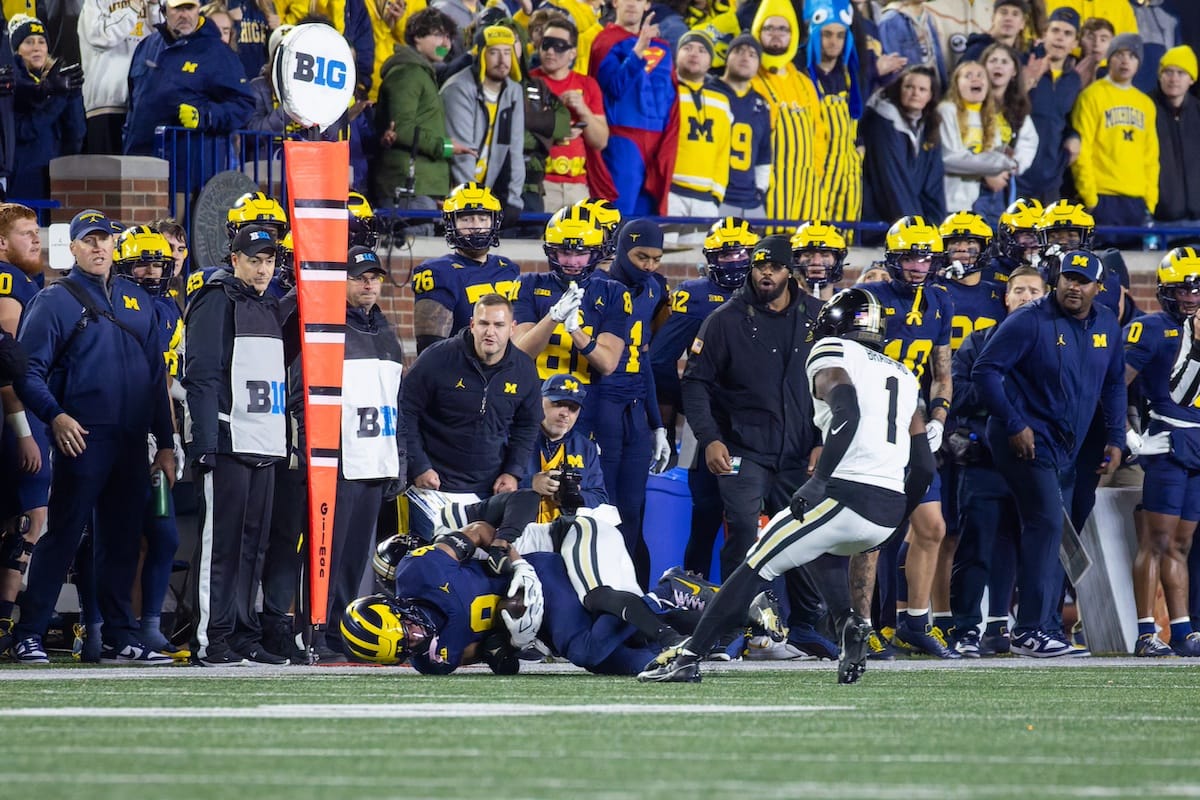 Former Michigan TE and Big Ten Network analyst Jake Butt poses for a selfie with fans. (Rachel Leggett/Mitten Football)Halloween costumes were plentiful at a game played the following day. (Rachel Leggett/Mitten Football)More costumes, these two as a pair of Jim Harbaughs. (Rachel Leggett/Mitten Football)Michigan Stadium with the lights turned down. (Rachel Leggett/Mitten Football)The banner, awaiting the Wolverines to come out of the tunnel pregame. (Rachel Leggett/Mitten Football)Running back Justice Haynes, who is out with an apparent foot injury, on a mobility scooter. (Rachel Leggett/Mitten Football)Tight ends Zack Marshall and Deakon Tonielli briefly pray pregame. (Rachel Leggett/Mitten Football)Ernest Hausmann makes a tackle with two other defenders bearing down. (Rachel Leggett/Mitten Football)TJ Metcalf wraps up a ball carrier in the open field. (Rachel Leggett/Mitten Football)The Wolverines hoisting sideline folding chairs above their heads to get the energy up. (Rachel Leggett/Mitten Football)No left sharks here. (Rachel Leggett/Mitten Football)Blake Frazier's right arm tattoo, which appears to be a Wolverine. (Rachel Leggett/Mitten Football)Jordan Marshall runs away from a defender, a common sight on Saturday night. (Rachel Leggett/Mitten Football)The Wolverines signal for a first down after a short yardage play. (Rachel Leggett/Mitten Football)Running back Bryson Kuzdzal runs through contact, backing up Marshall with Haynes out. (Rachel Leggett/Mitten Football)Marshall squeezing out a scrum to score a touchdown. (Rachel Leggett/Mitten Football)Marshall slips free from the thicket of defenders. (Rachel Leggett/Mitten Football)And with some balance and acceleration, he started to scamper away. (Rachel Leggett/Mitten Football)All the defenders could do is watch. (Rachel Leggett/Mitten Football)And Marshall got to celebrate one of his three touchdowns on the night. (Rachel Leggett/Mitten Football)Marshall finished with a career-high 210 total yards. (Rachel Leggett/Mitten Football)The other Marshall, tight end Zack Marshall, moves through traffic after making a catch. (Rachel Leggett/Mitten Football)TJ Metcalf hurdles over a ball carrier down on the ground. (Rachel Leggett/Mitten Football)Channing Goodwin holds on tight to make a reception down the right sideline. (Rachel Leggett/Mitten Football)Tre Williams celebrates a play at the line of scrimmage. Michigan held Purdue to 276 total yards. (Rachel Leggett/Mitten Football)Marlin Klein gets dumped to the turf by a trio of defenders. (Rachel Leggett/Mitten Football)Purdue defenders celebrate one of two turnovers off of Bryce Underwood. (Rachel Leggett/Mitten Football)Underwood looks to run from the pocket behind Jake Guarnera blocking. (Rachel Leggett/Mitten Football)Underwood calls out a check to the offense. (Rachel Leggett/Mitten Football)Underwood gets brought down by a group of Boilermakers. (Rachel Leggett/Mitten Football)Michigan fans, perplexed. (Rachel Leggett/Mitten Football)Andrew Marsh tries to maneuver through traffic with the ball. (Rachel Leggett/Mitten Football)Marshall runs away for defenders for another of his three TDs. (Rachel Leggett/Mitten Football)A Purdue defender lays out to push Marshall out of bounds. (Rachel Leggett/Mitten Football)Wideout Logan Forbes runs down as a punt gunner. (Rachel Leggett/Mitten Football)Hausmann wags a finger after making a play. (Rachel Leggett/Mitten Football)The Michigan defense swarms to make a tackle. (Rachel Leggett/Mitten Football)Williams bullies through the line to pursue Purdue QB Ryan Browne. (Rachel Leggett/Mitten Football)Edge rusher TJ Guy celebrates. (Rachel Leggett/Mitten Football)Underwood and Marshall shake hands in the end zone after a score. (Rachel Leggett/Mitten Football)The Michigan Marching Band's drum line performs. (Rachel Leggett/Mitten Football)Head coach Sherrone Moore interviewed on Big Ten Network postgame. (Rachel Leggett/Mitten Football)Marshall and Underwood both got some air time, too. (Rachel Leggett/Mitten Football)And Marshall, the start of the night, made some time with fans postgame. (Rachel Leggett/Mitten Football)And it was a good night for selfie-seekers at the Michigan Stadium tunnel. (Rachel Leggett/Mitten Football)