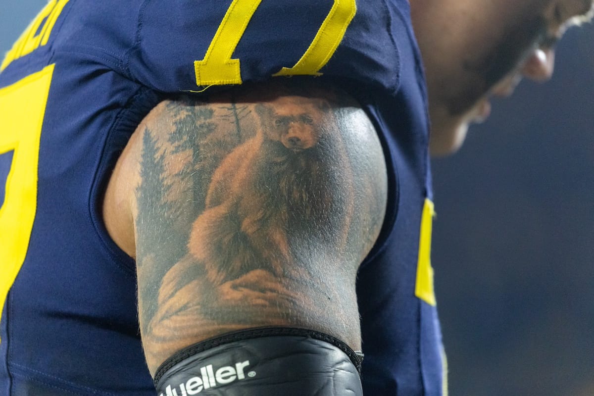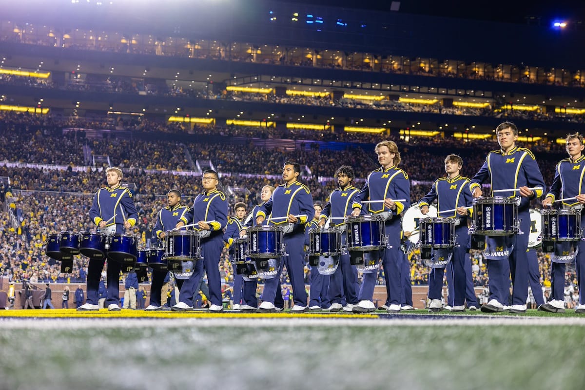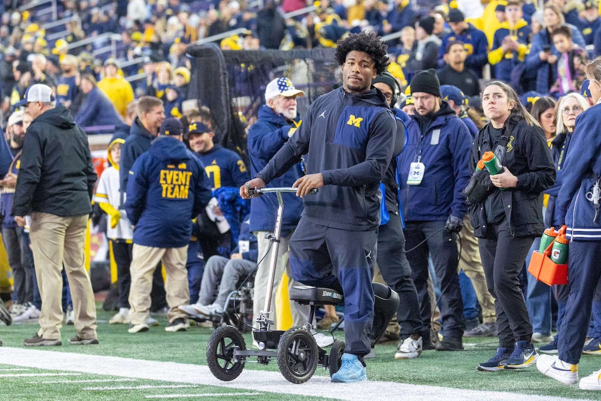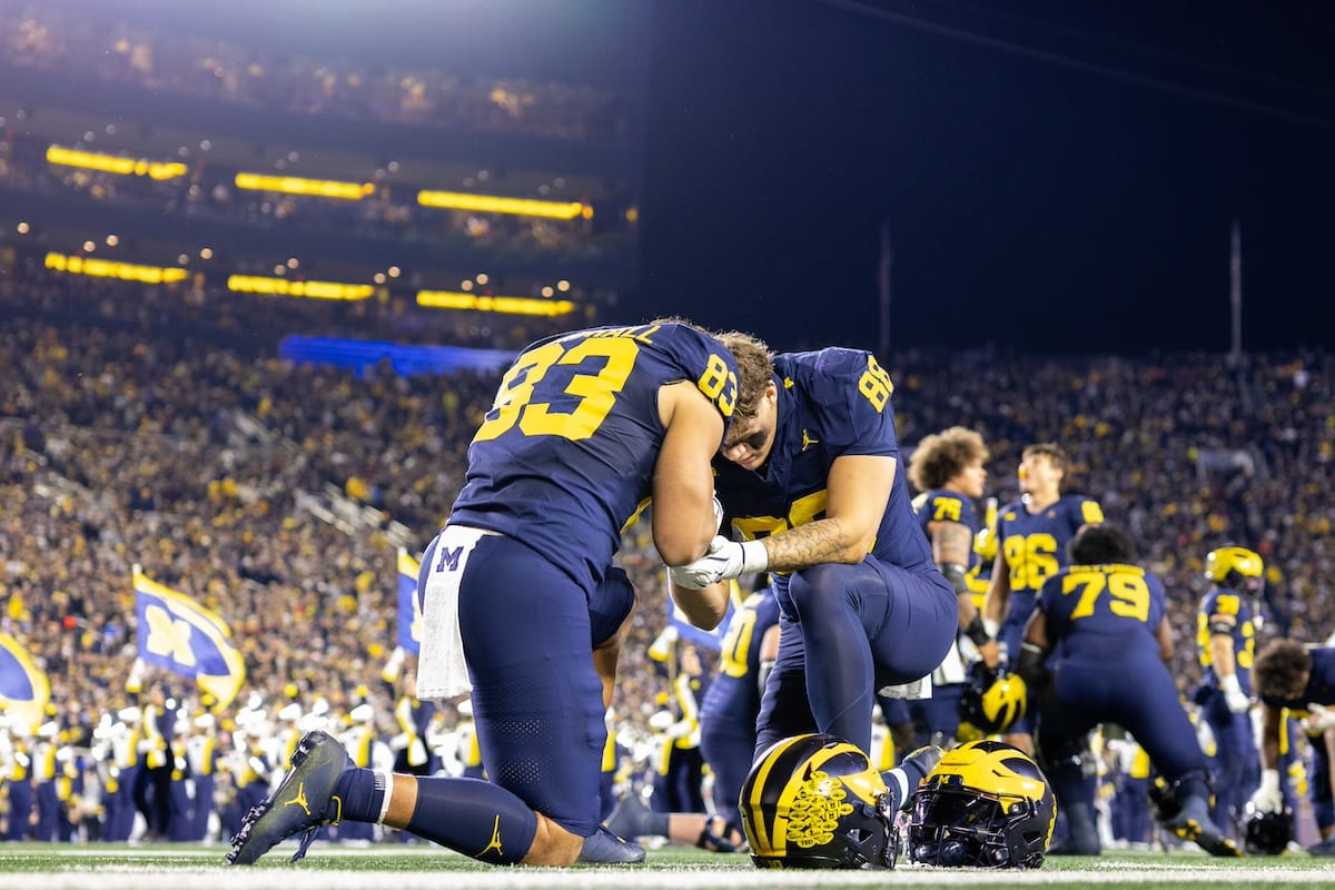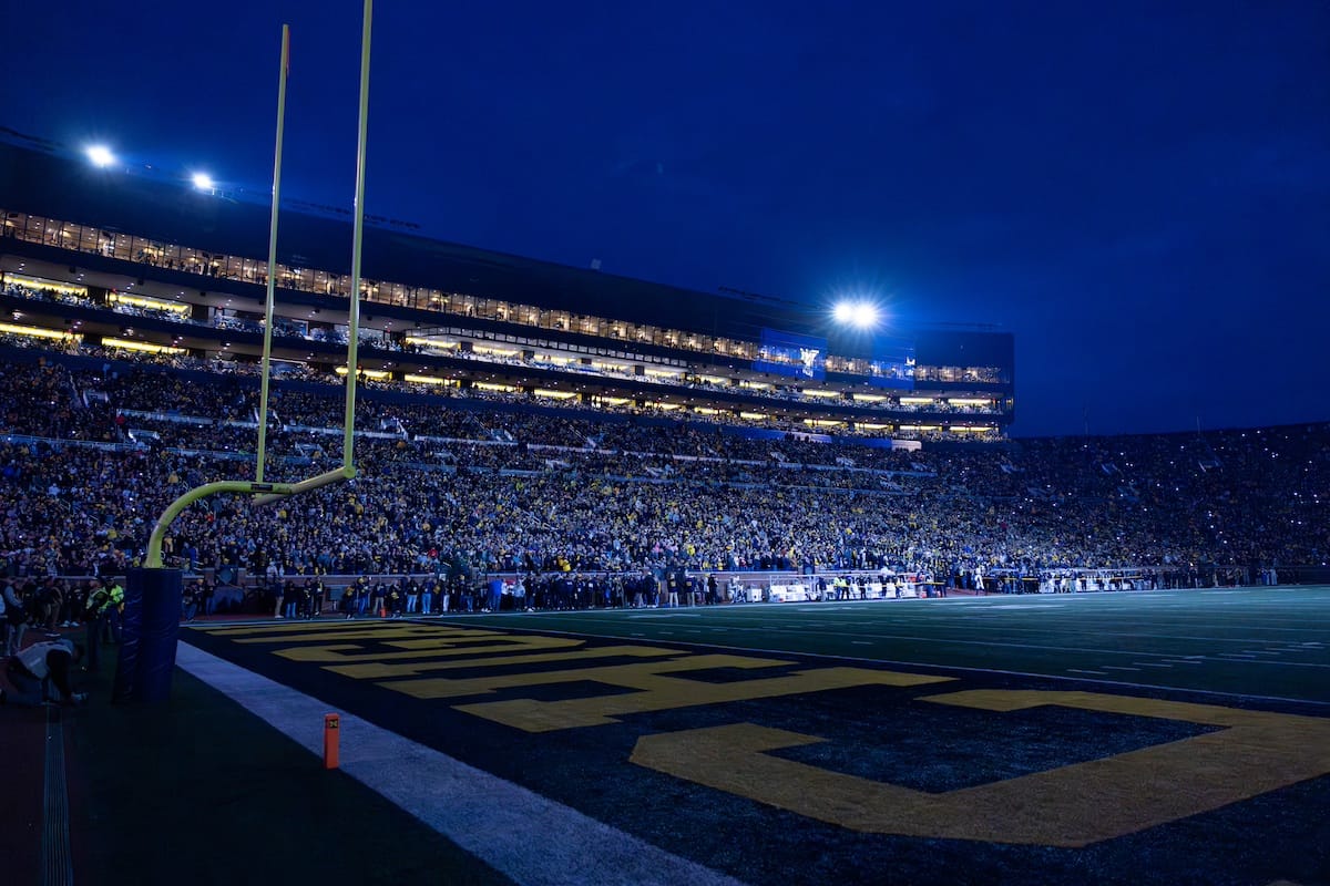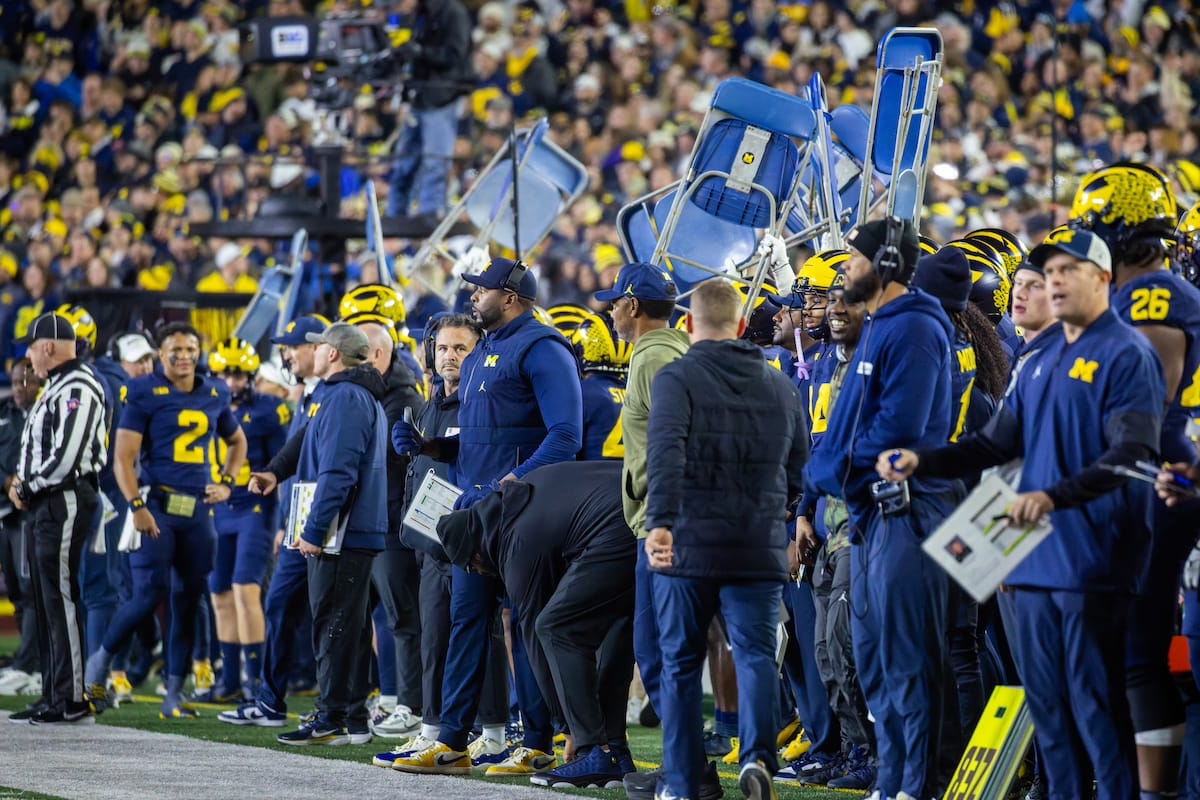 Former Michigan TE and Big Ten Network analyst Jake Butt poses for a selfie with fans. (Rachel Leggett/Mitten Football)Halloween costumes were plentiful at a game played the following day. (Rachel Leggett/Mitten Football)More costumes, these two as a pair of Jim Harbaughs. (Rachel Leggett/Mitten Football)Michigan Stadium with the lights turned down. (Rachel Leggett/Mitten Football)The banner, awaiting the Wolverines to come out of the tunnel pregame. (Rachel Leggett/Mitten Football)Running back Justice Haynes, who is out with an apparent foot injury, on a mobility scooter. (Rachel Leggett/Mitten Football)Tight ends Zack Marshall and Deakon Tonielli briefly pray pregame. (Rachel Leggett/Mitten Football)Ernest Hausmann makes a tackle with two other defenders bearing down. (Rachel Leggett/Mitten Football)TJ Metcalf wraps up a ball carrier in the open field. (Rachel Leggett/Mitten Football)The Wolverines hoisting sideline folding chairs above their heads to get the energy up. (Rachel Leggett/Mitten Football)No left sharks here. (Rachel Leggett/Mitten Football)Blake Frazier's right arm tattoo, which appears to be a Wolverine. (Rachel Leggett/Mitten Football)Jordan Marshall runs away from a defender, a common sight on Saturday night. (Rachel Leggett/Mitten Football)The Wolverines signal for a first down after a short yardage play. (Rachel Leggett/Mitten Football)Running back Bryson Kuzdzal runs through contact, backing up Marshall with Haynes out. (Rachel Leggett/Mitten Football)Marshall squeezing out a scrum to score a touchdown. (Rachel Leggett/Mitten Football)Marshall slips free from the thicket of defenders. (Rachel Leggett/Mitten Football)And with some balance and acceleration, he started to scamper away. (Rachel Leggett/Mitten Football)All the defenders could do is watch. (Rachel Leggett/Mitten Football)And Marshall got to celebrate one of his three touchdowns on the night. (Rachel Leggett/Mitten Football)Marshall finished with a career-high 210 total yards. (Rachel Leggett/Mitten Football)The other Marshall, tight end Zack Marshall, moves through traffic after making a catch. (Rachel Leggett/Mitten Football)TJ Metcalf hurdles over a ball carrier down on the ground. (Rachel Leggett/Mitten Football)Channing Goodwin holds on tight to make a reception down the right sideline. (Rachel Leggett/Mitten Football)Tre Williams celebrates a play at the line of scrimmage. Michigan held Purdue to 276 total yards. (Rachel Leggett/Mitten Football)Marlin Klein gets dumped to the turf by a trio of defenders. (Rachel Leggett/Mitten Football)Purdue defenders celebrate one of two turnovers off of Bryce Underwood. (Rachel Leggett/Mitten Football)Underwood looks to run from the pocket behind Jake Guarnera blocking. (Rachel Leggett/Mitten Football)Underwood calls out a check to the offense. (Rachel Leggett/Mitten Football)Underwood gets brought down by a group of Boilermakers. (Rachel Leggett/Mitten Football)Michigan fans, perplexed. (Rachel Leggett/Mitten Football)Andrew Marsh tries to maneuver through traffic with the ball. (Rachel Leggett/Mitten Football)Marshall runs away for defenders for another of his three TDs. (Rachel Leggett/Mitten Football)A Purdue defender lays out to push Marshall out of bounds. (Rachel Leggett/Mitten Football)Wideout Logan Forbes runs down as a punt gunner. (Rachel Leggett/Mitten Football)Hausmann wags a finger after making a play. (Rachel Leggett/Mitten Football)The Michigan defense swarms to make a tackle. (Rachel Leggett/Mitten Football)Williams bullies through the line to pursue Purdue QB Ryan Browne. (Rachel Leggett/Mitten Football)Edge rusher TJ Guy celebrates. (Rachel Leggett/Mitten Football)Underwood and Marshall shake hands in the end zone after a score. (Rachel Leggett/Mitten Football)The Michigan Marching Band's drum line performs. (Rachel Leggett/Mitten Football)Head coach Sherrone Moore interviewed on Big Ten Network postgame. (Rachel Leggett/Mitten Football)Marshall and Underwood both got some air time, too. (Rachel Leggett/Mitten Football)And Marshall, the start of the night, made some time with fans postgame. (Rachel Leggett/Mitten Football)And it was a good night for selfie-seekers at the Michigan Stadium tunnel. (Rachel Leggett/Mitten Football)