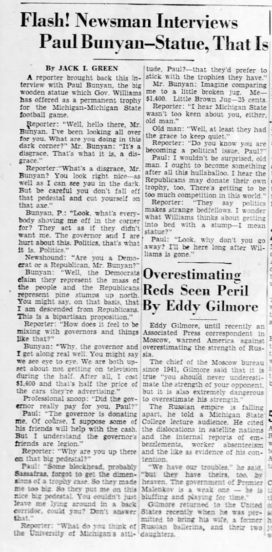 The Enquirer published an “interview” with the statue, which predicted Paul Bunyan’s place in the rivalry would long outlive Williams, bridging a gap amongst Michiganders.