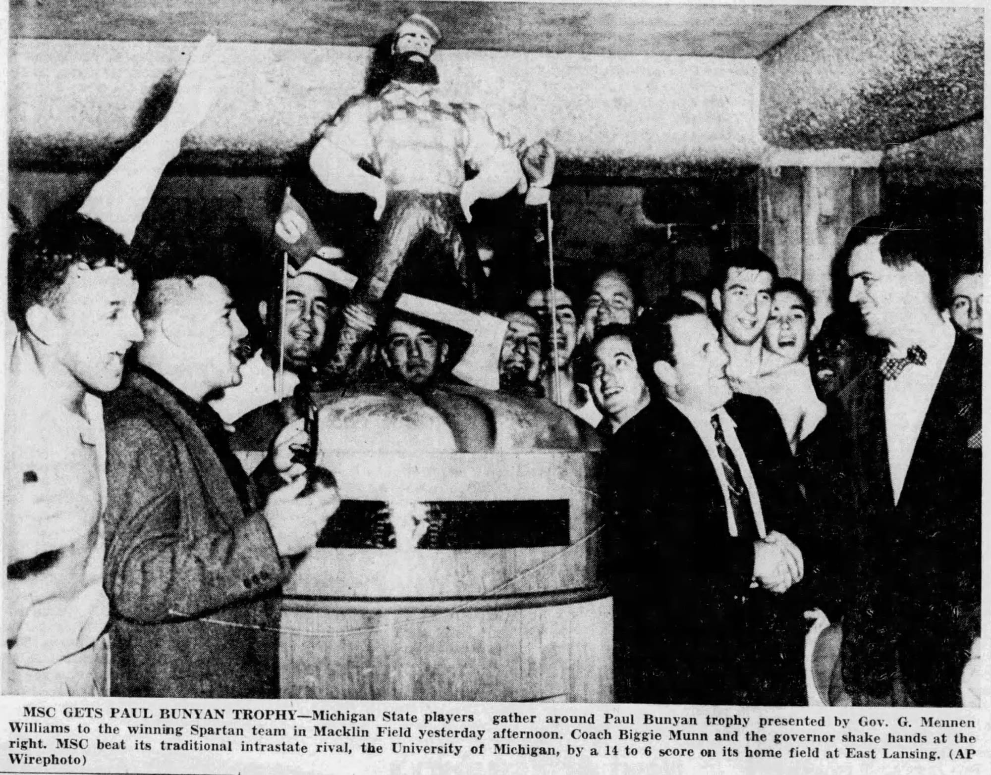 And every year now, waiting on a sideline to greet the winners, is Paul Bunyan, a legacy predicted by the Battle Creek Enquirer on Nov. 15, 1953, the day after Michigan State won the trophy for the first time.